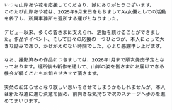 终于,宣布了。一直没有更新社群让大家担心的「最美女主播」山岸あや花 (山岸绮花 ),刚刚透过经纪公司的官方X宣布了引退的消息:声明说了,山岸あや花(山岸绮花)将会在9月底的时候离开经纪公司,并且,AV引退ー